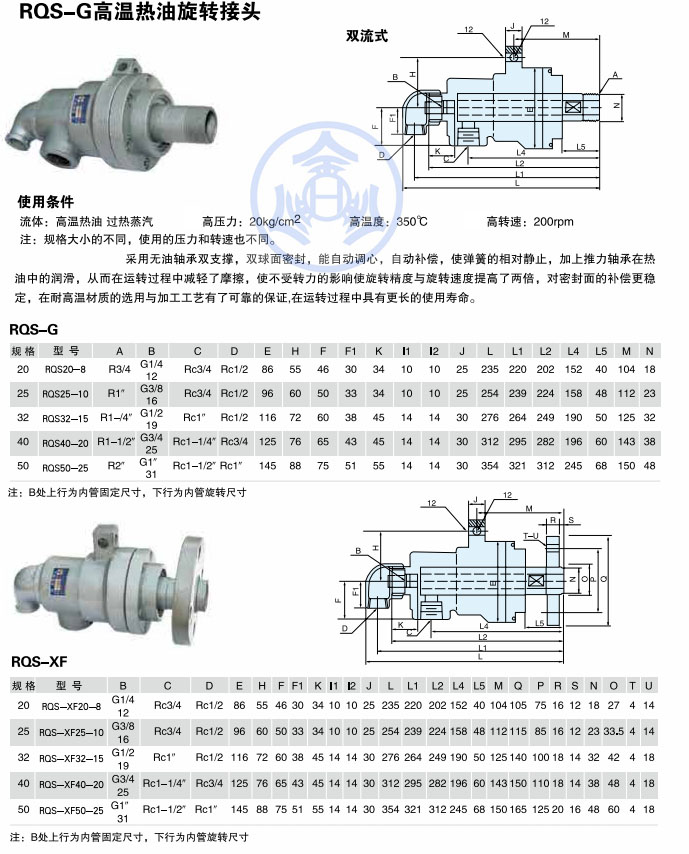 RQ型导热油旋转接头在Q型基本型作重要改进,采用无油轴承双支撑,双球面密封,能自动调节中心,自动补偿,使弹簧的相对静止,加上推力轴承在热油中的润滑,从而在运转的过程中减轻了摩擦,使不受转力的影响使旋转精度与旋转速度提高了两倍,对密封的补偿更稳定,在耐高温材质的选用与加工工艺有了稳定的校正,在运转过程中具有延长使用寿命。